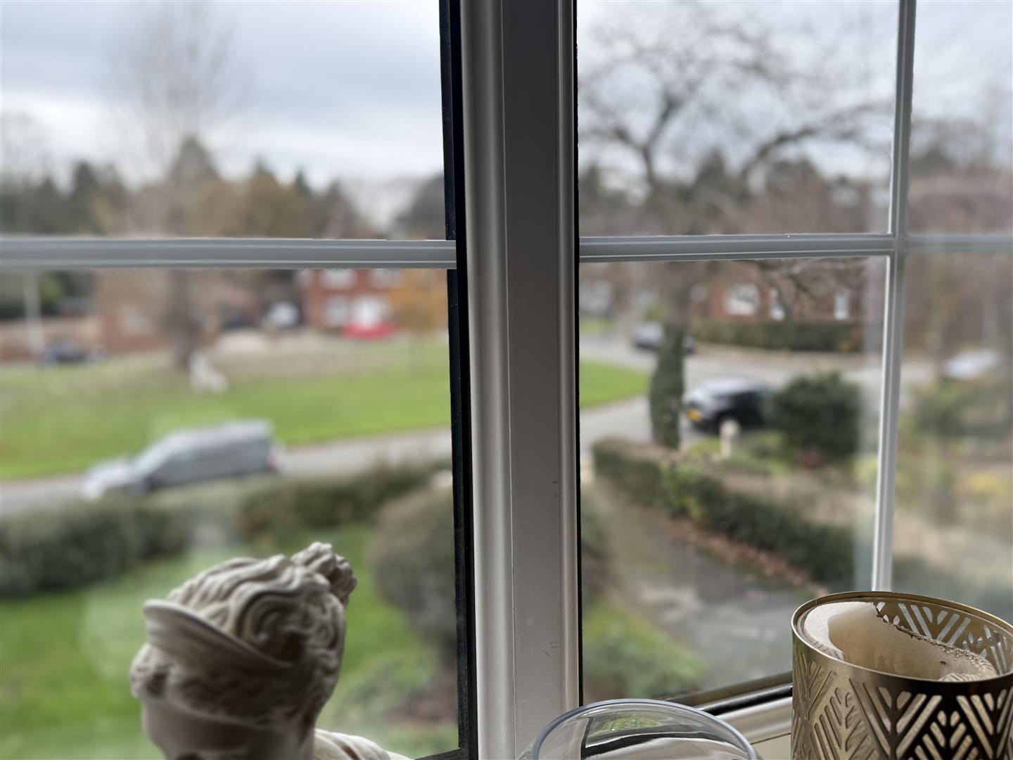 This bedroom has views across the green to the front.
