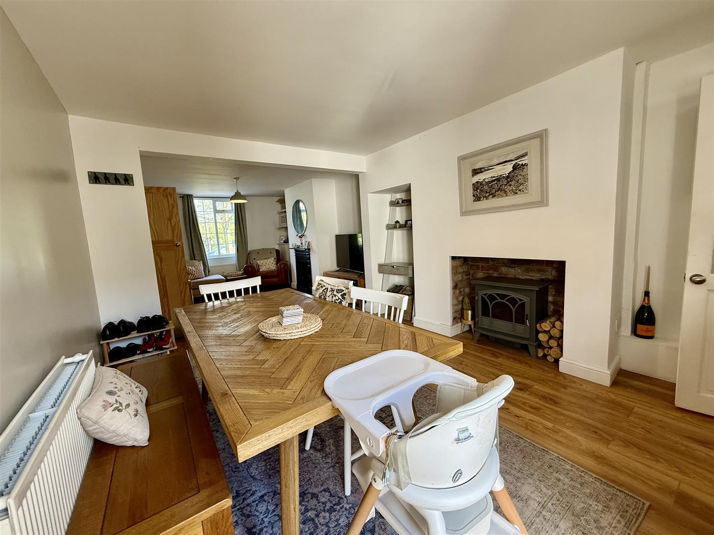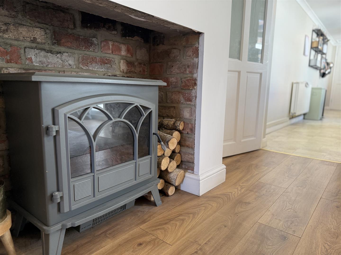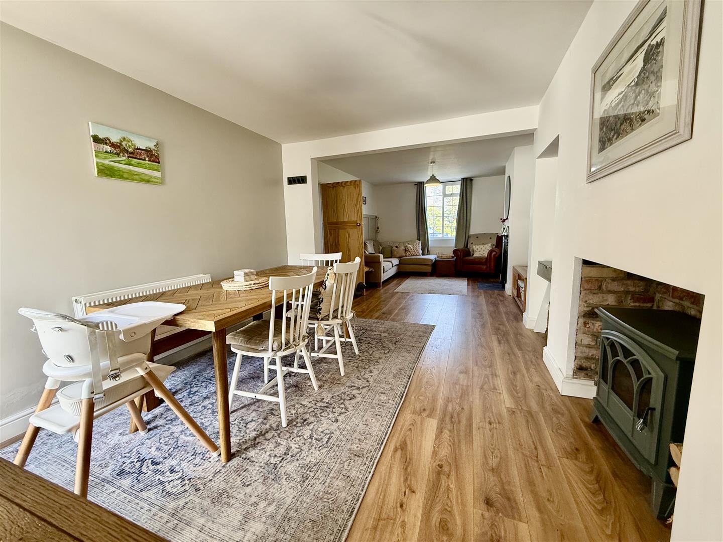 With an inset chimney breast with log burning stove and window to the front aspect. The room is open plan to the dining room.