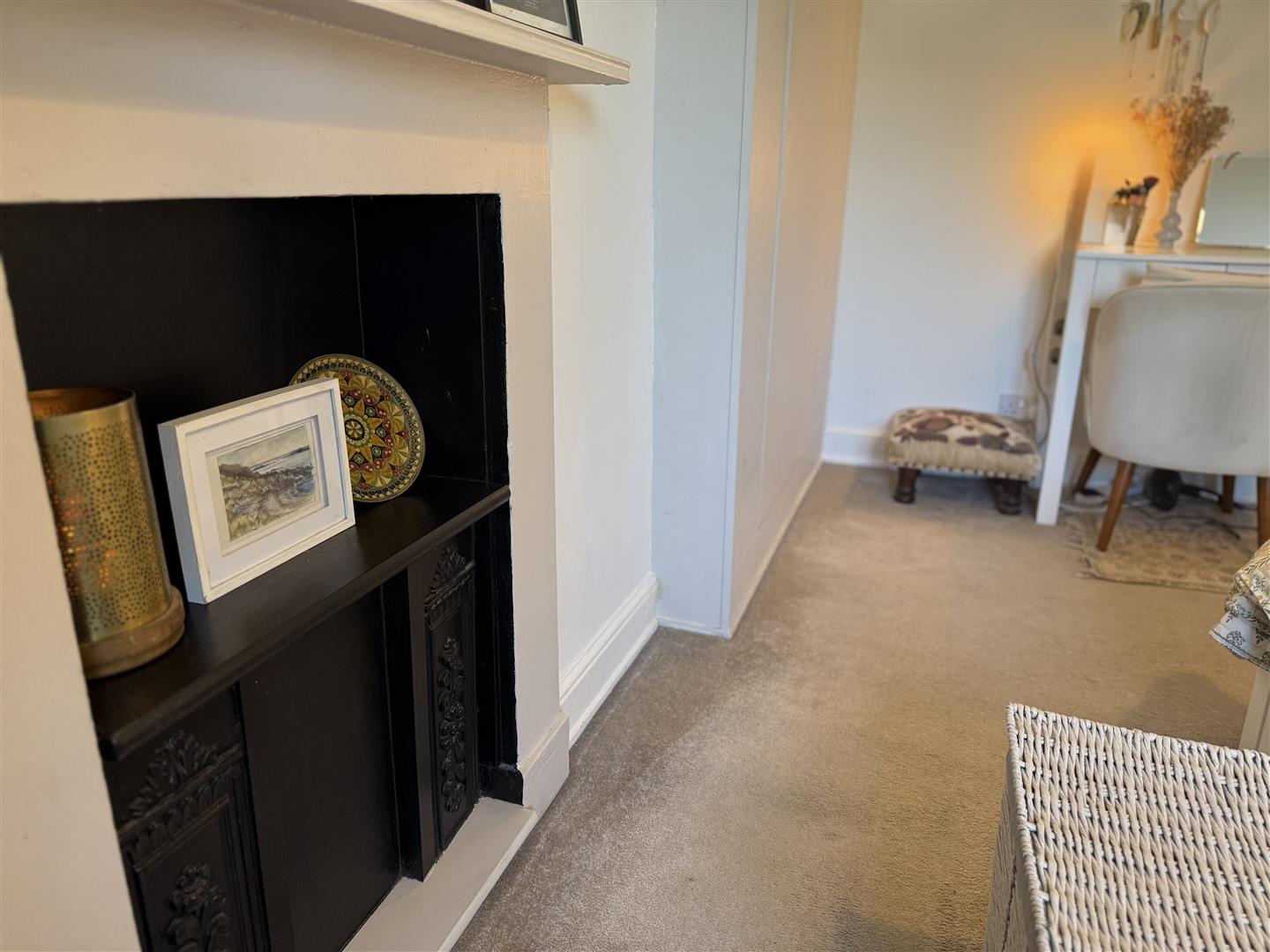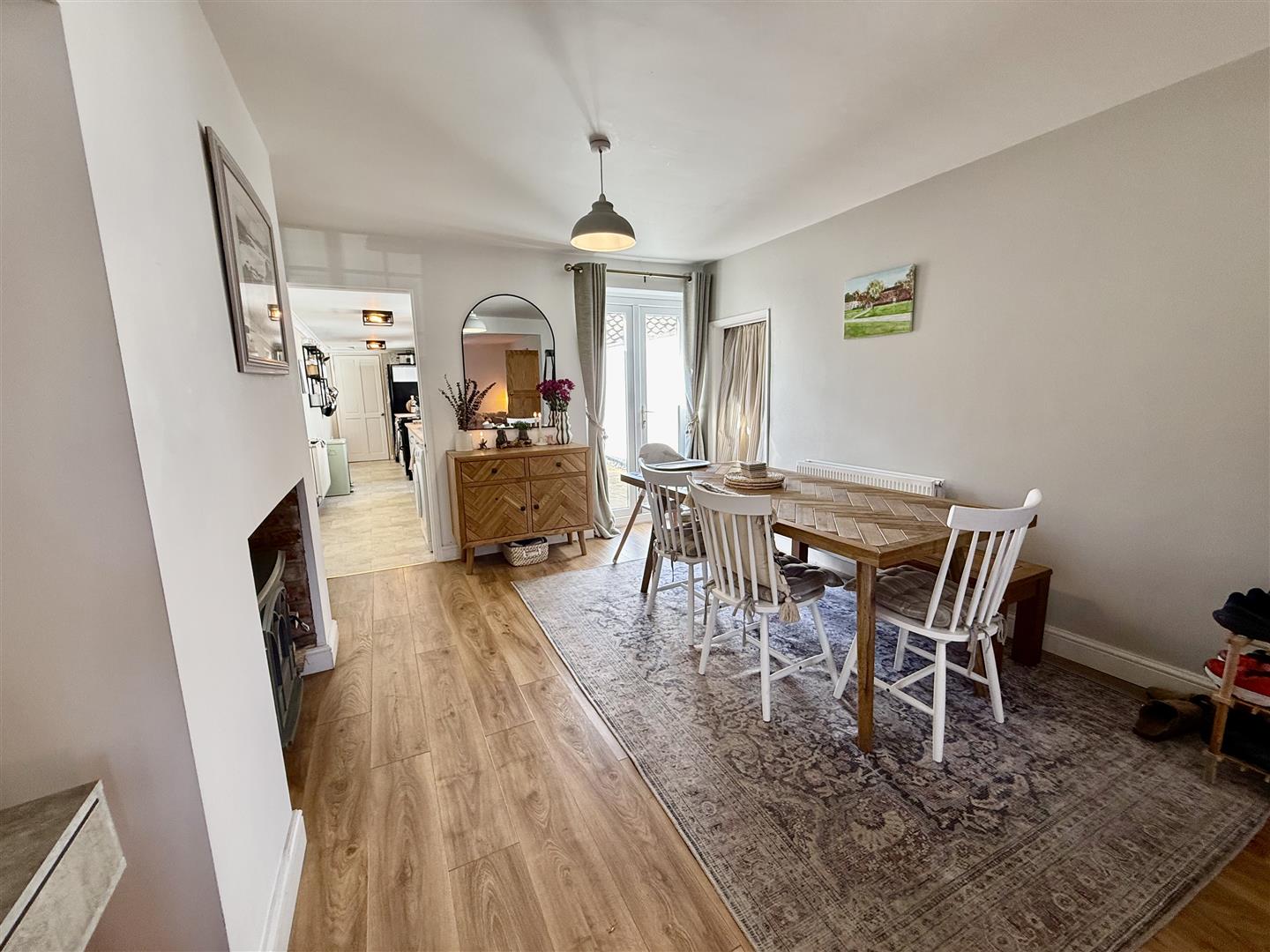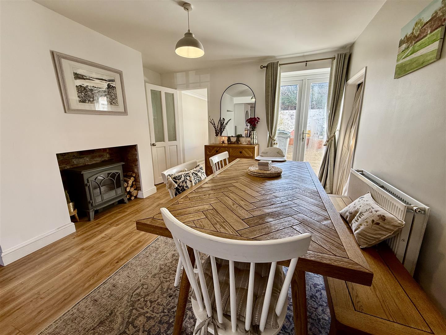 With an inset chimney breast with log burning stove and window to the front aspect. The room is open plan to the dining room.