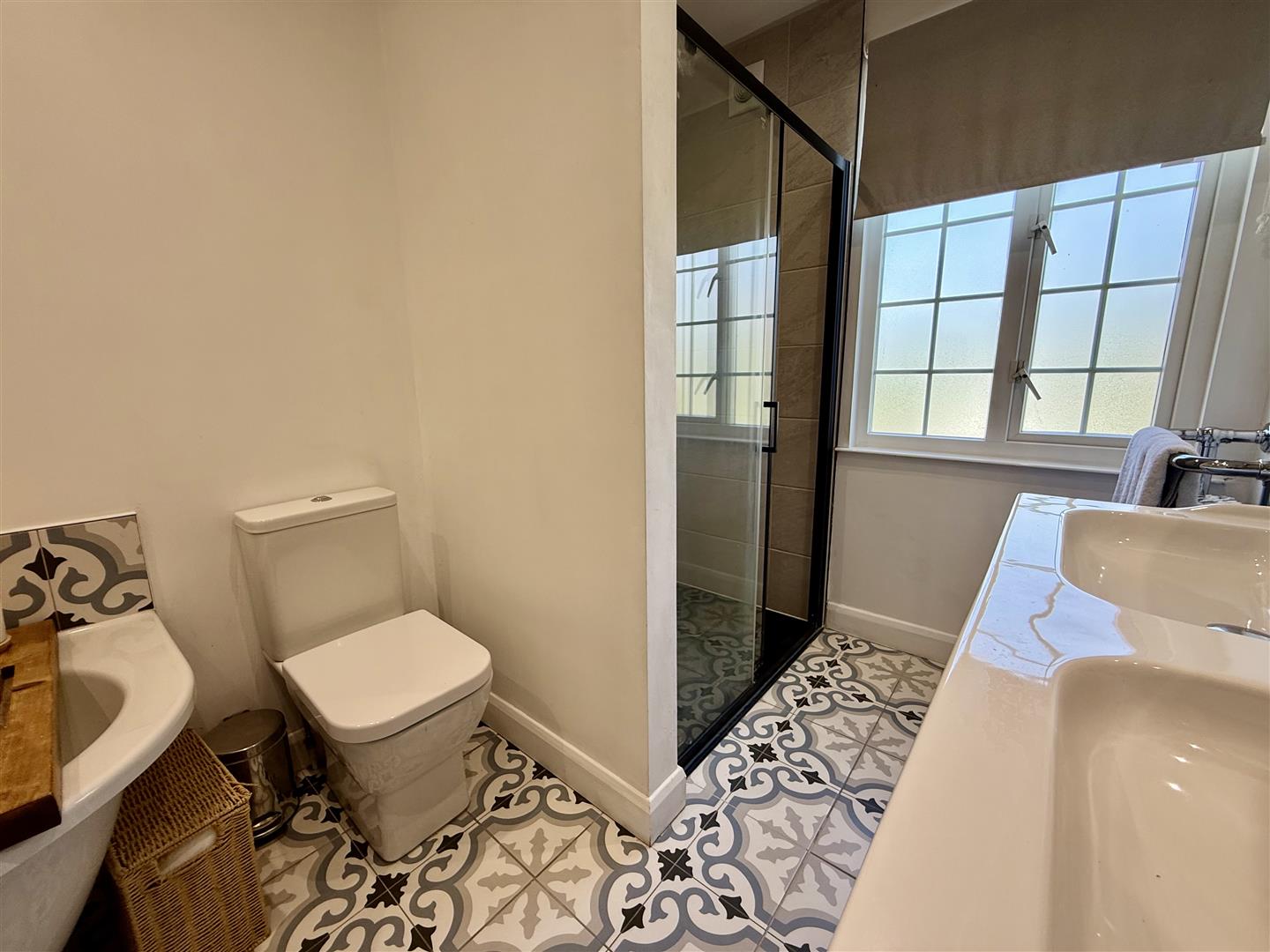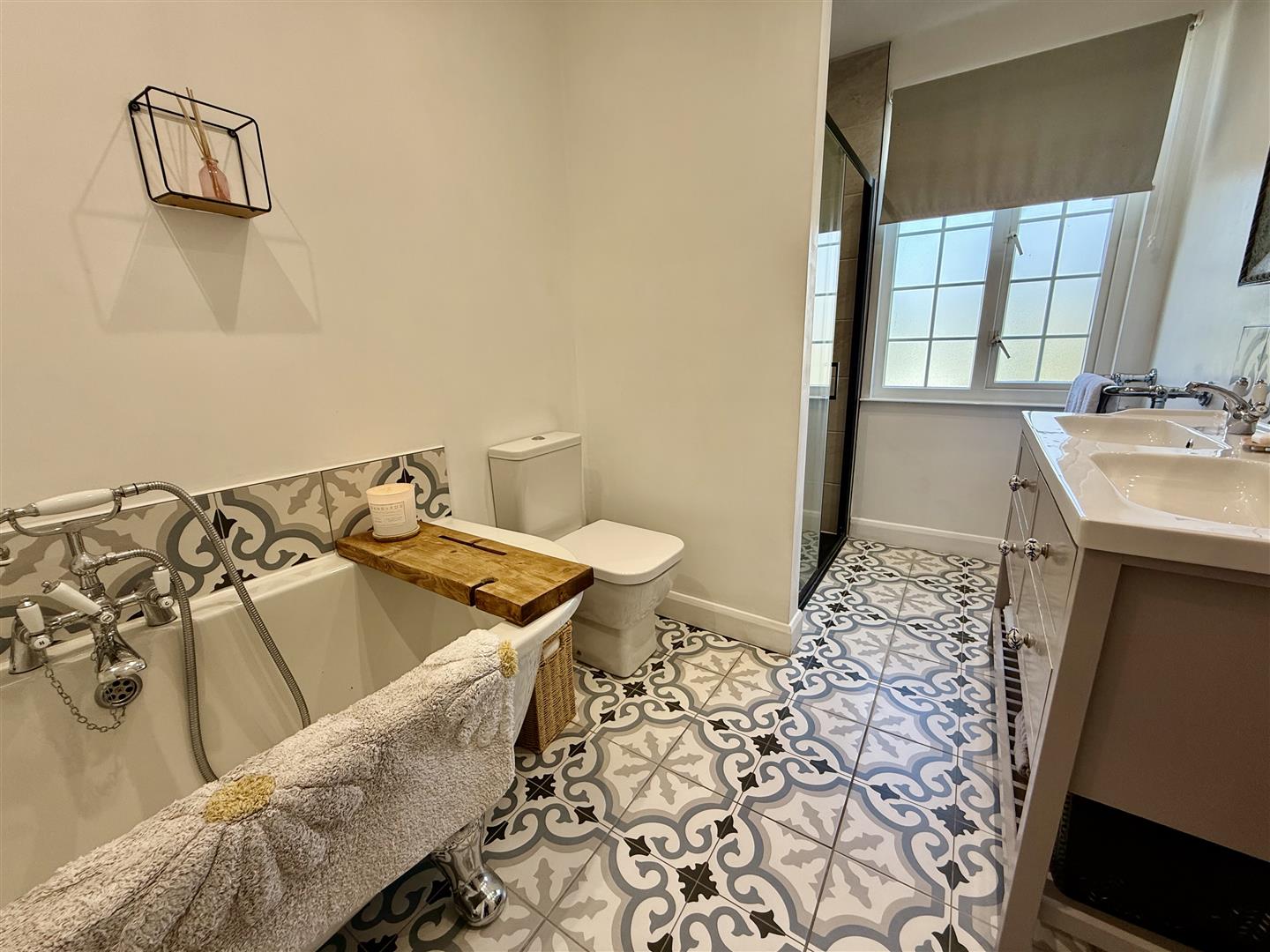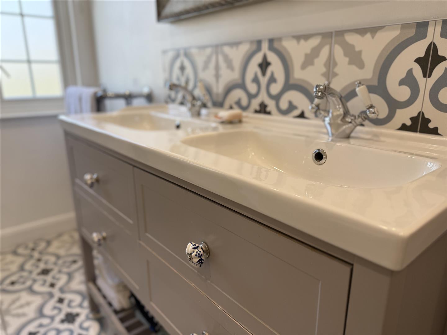 A real statement bathroom with stand alone claw foot bath, double vanity basins within stylish unit and a large walk in shower cubicle with monochrome mains fed shower fitment.