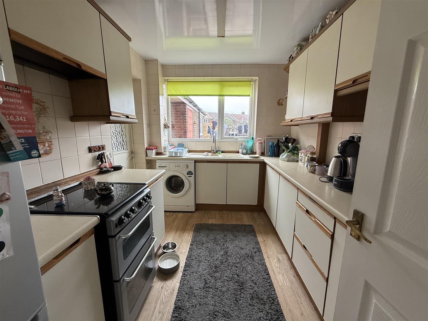 With a range of cabinets, gas cooker, plumbing for an automatic washing machine. A door at the side opens into a passage that leads through to the rear garden and garage.