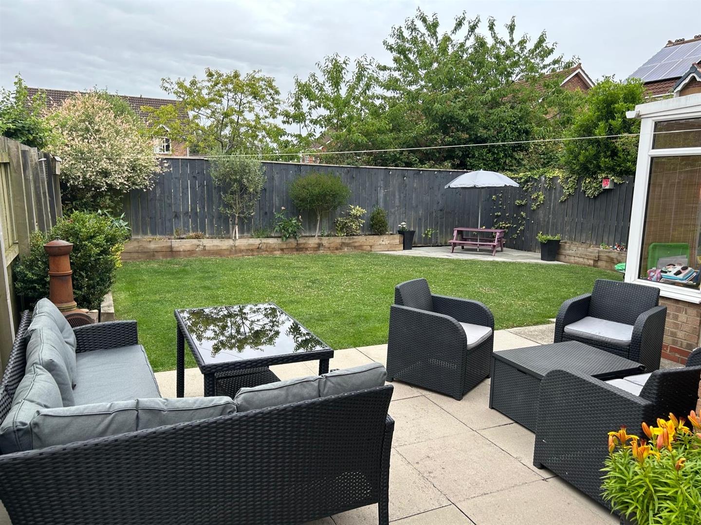 Externally, the house has well-kept gardens, perfect for enjoying the outdoors. A garage and an extended driveway for off-street parking add to the convenience.