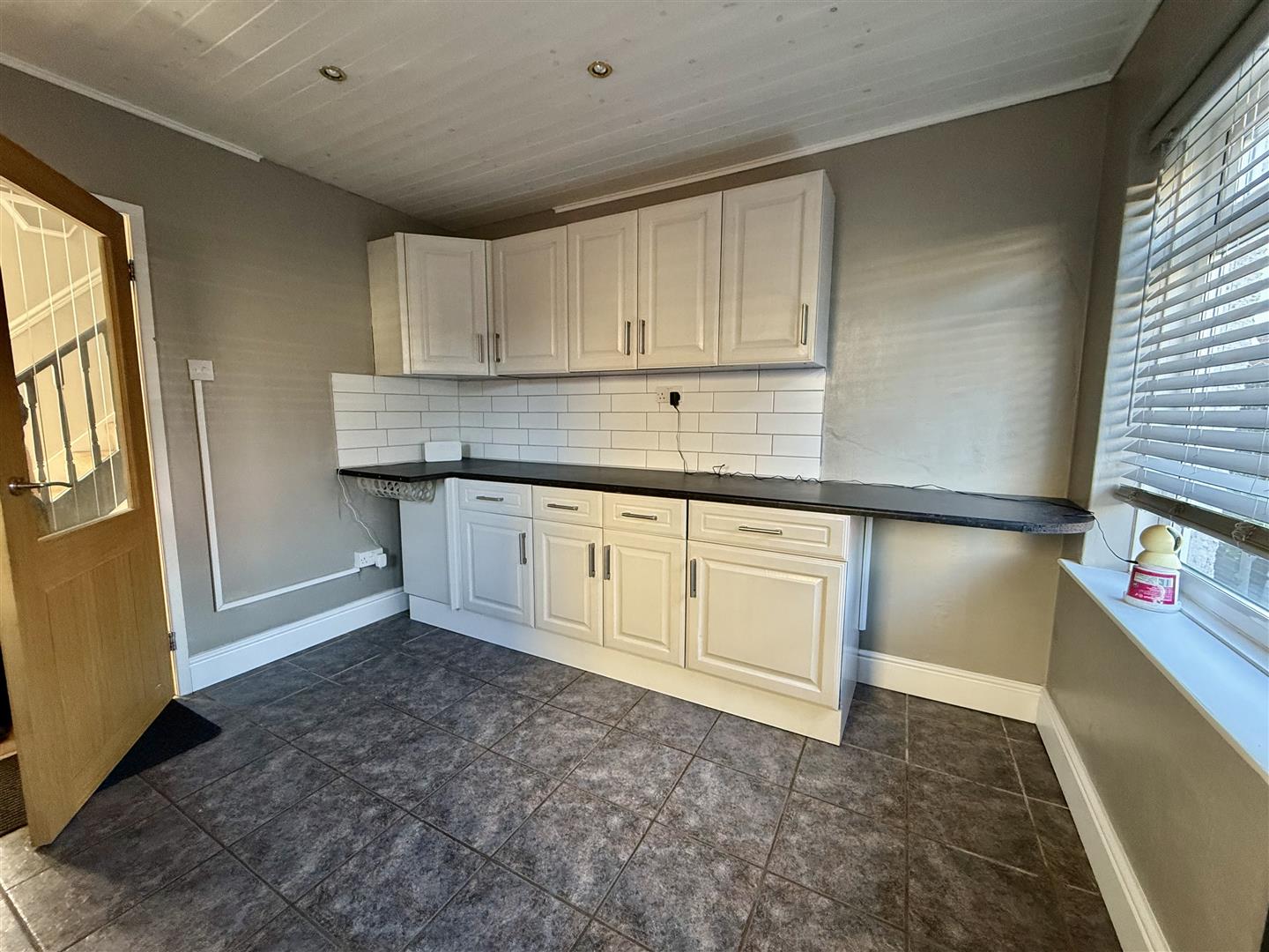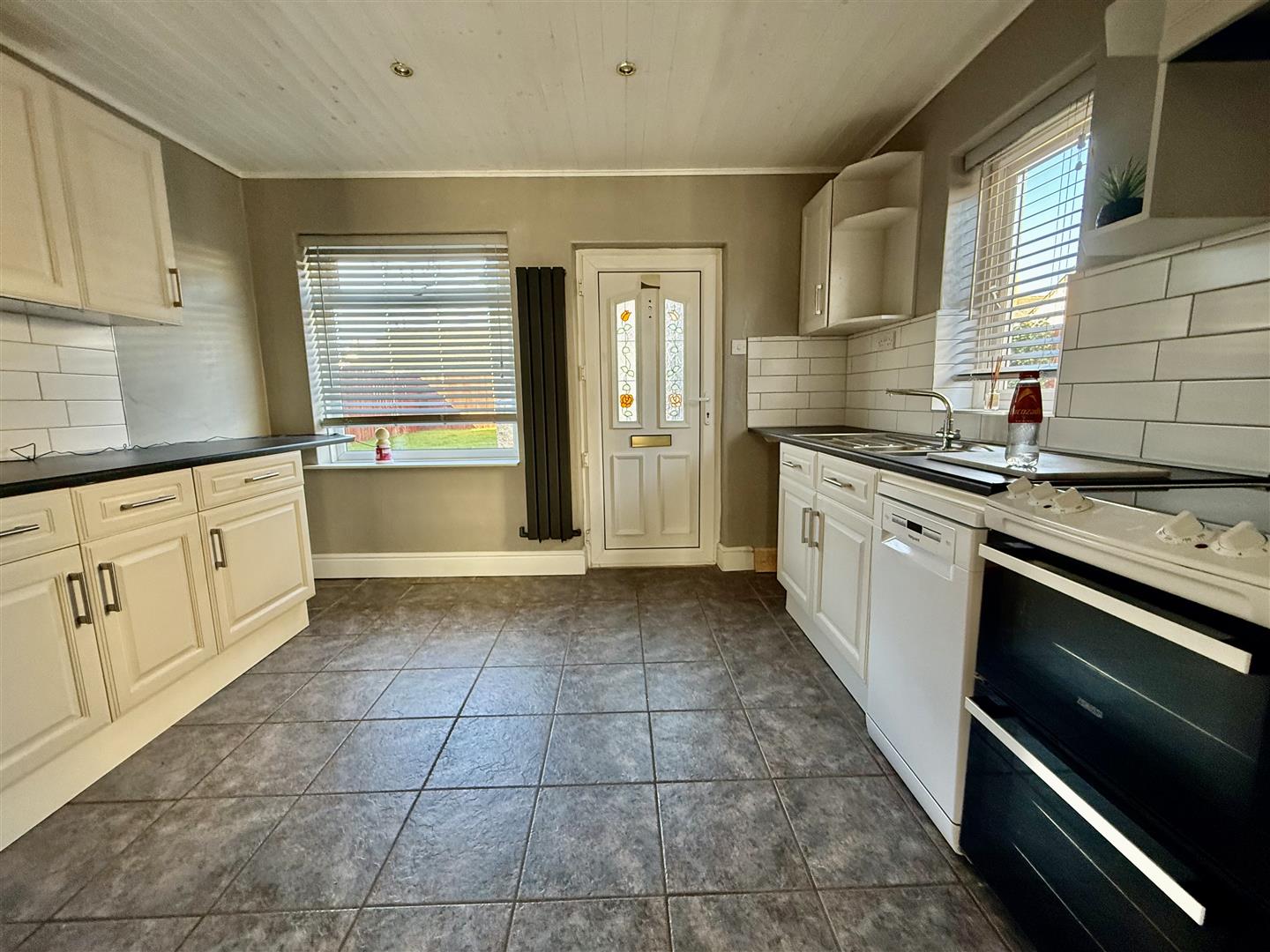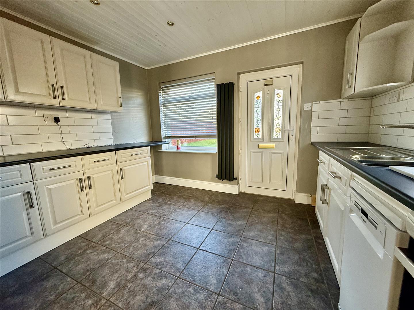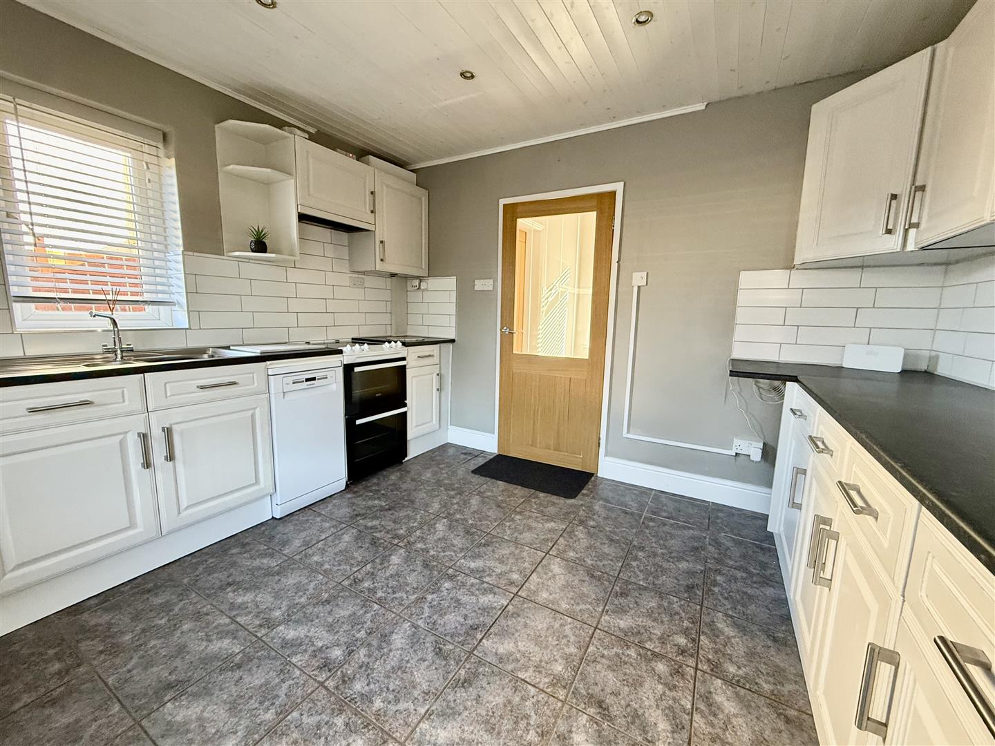 The kitchen is fitted with an ample range of cabinets in white with complementing worksurfaces and stainless steel sink unit. There is a free standing electric cooker and dishwasher and also plumbing for an automatic washing machine. The floor is tiled and the room has two windows, one to the rear and one to the side and a door which leads to the rear garden.