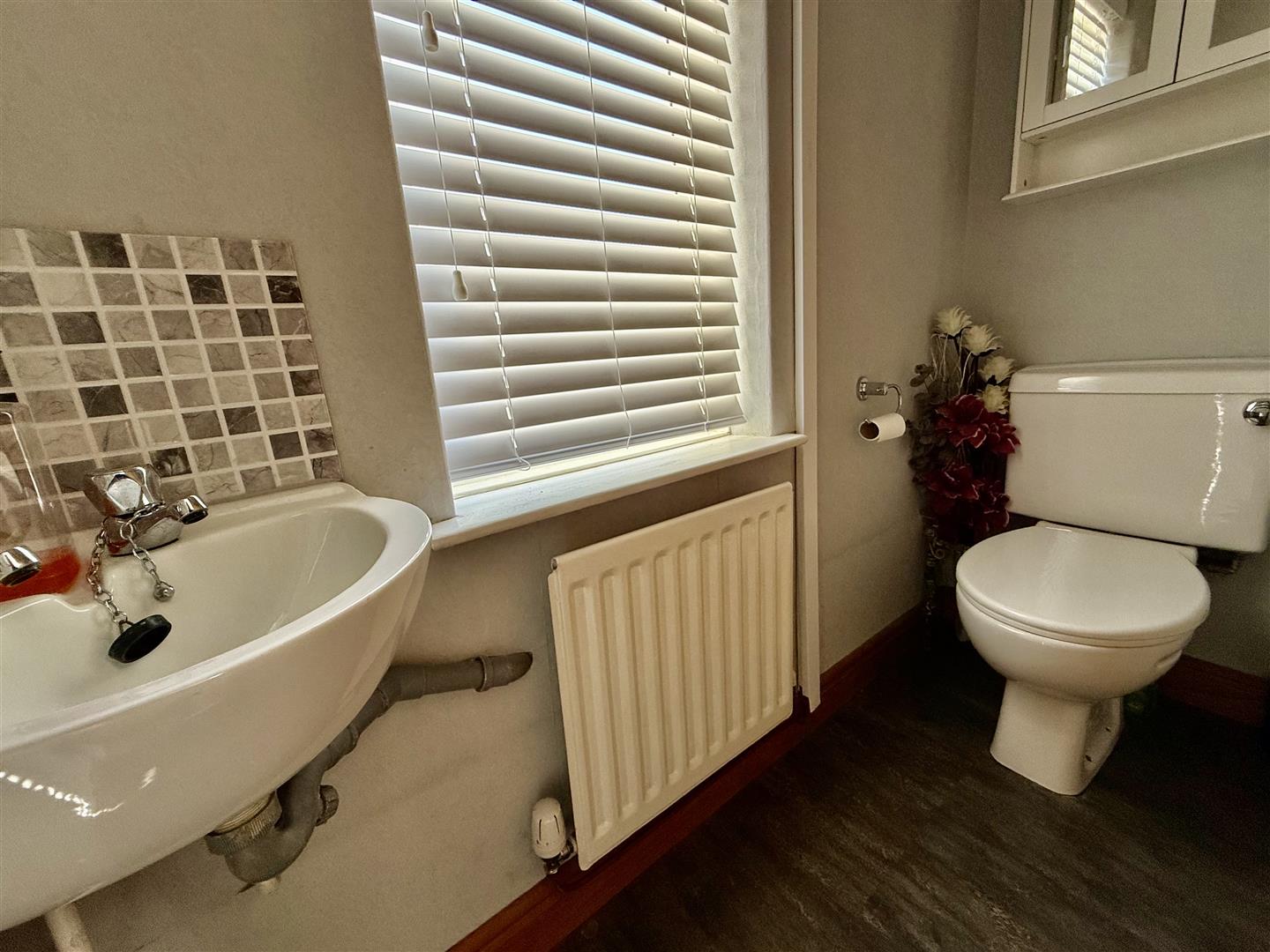 Comprising a white suite with low level WC and handbasin with a window to the side and tiled effect laminate flooring.