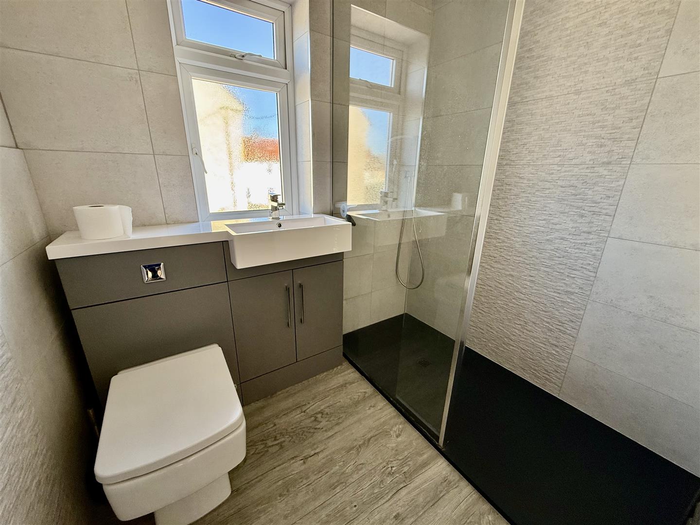 Comprising a modern suite with waterfall, mains fed shower, WC and hand basin. The room has been finished with tiled surrounds and has a chrome heated towel rail.